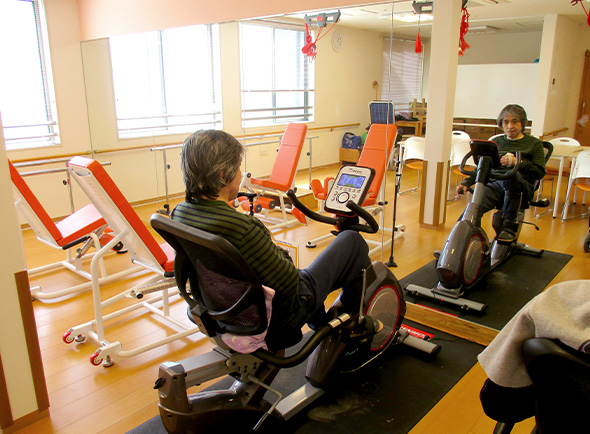 リハビリ機器や筋力トレーニング機器を備えたデイルームを併設しています。リハビリをしながら永く穏やかに生活できるように、万全のサポートをします。